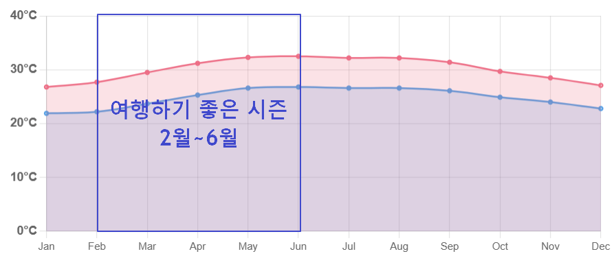 특히, 2월에서 6월까지는 날씨가 맑고 기온이 26℃~32℃ 정도로 따뜻하여 해수욕을 즐기기에 이상적인 날씨입니다.
