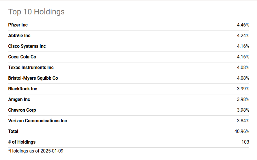 SCHD ETF는 배당 안정성이 높은 대형주에 집중 투자하고 있습니다. 2024년 기준 주요 보유 종목에는 애플, 마이크로소프트, 코카콜라, 펩시코와 같은 대형주가 포함되어 있습니다.