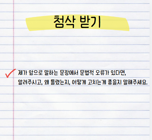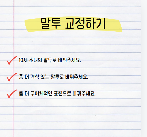 상황 제시하는 방법부터, 규칙 정하기, 말투 교정하기, 첨삭 받기의 방법을 어떻게 활용하는지 소개드리겠습니다.
