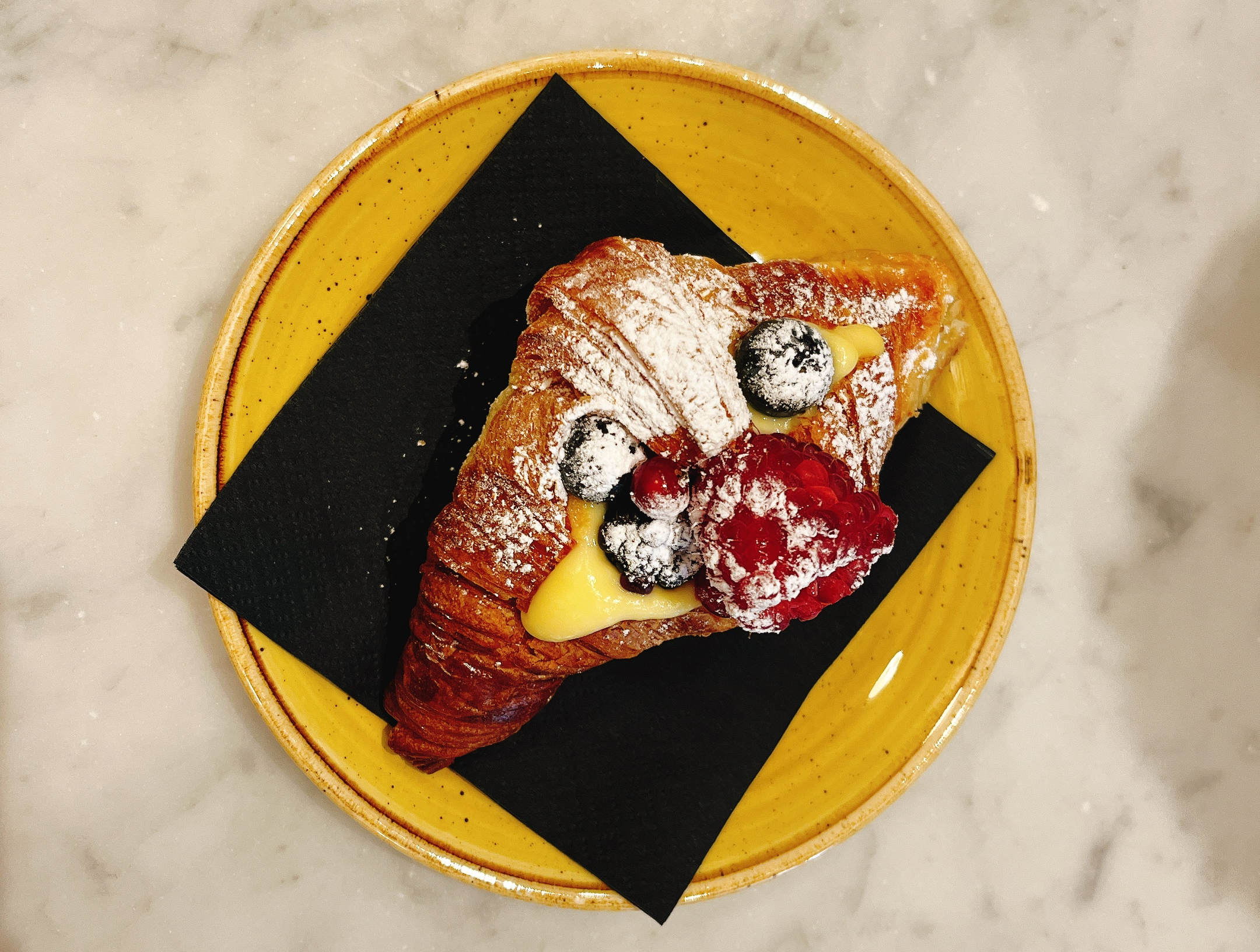 저희는 카푸치노와 클럽 샌드위치 바닐라 크림이 들어간 크루아상을 주문했습니다.