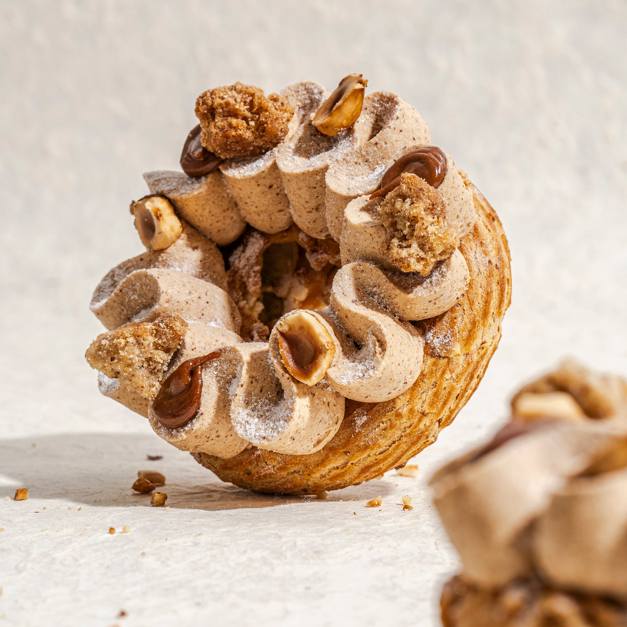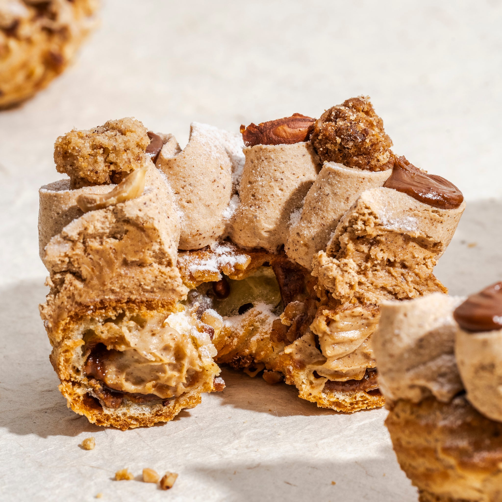 프랑스의 클래식 디저트인 파리-브레스트는 Jeffrey Cagnes의 손길을 거쳐 더 부드럽고 풍부한 크림과 바삭한 아몬드가 조화를 이루는 디저트입니다.